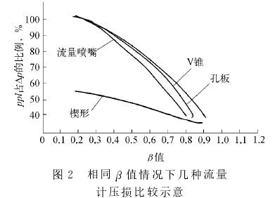 楔形流量计比孔板、V锥、喷嘴的压力损失小,相同β值情况下几种流量计压损比较[5]如图2所示。